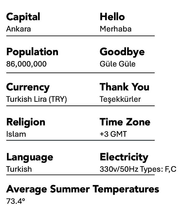 Be ready for your next trip to Turkey with some simple facts that will help you the moment you arrive. From population to religion, be in the know before you go.